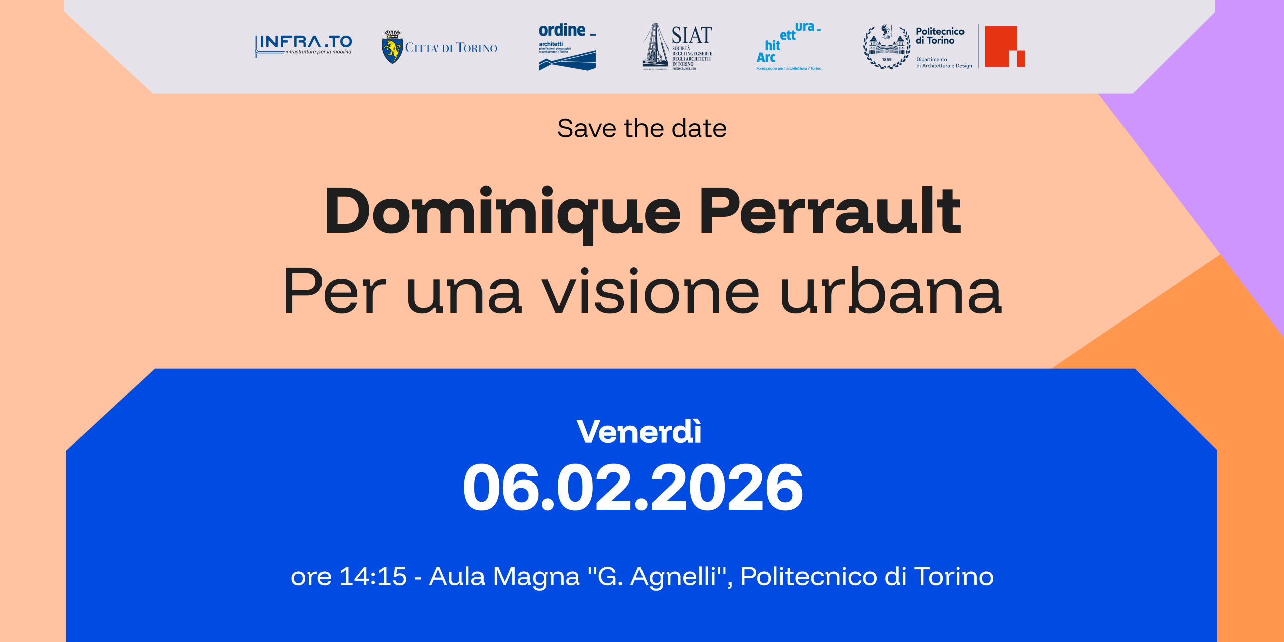 Il 6 febbraio 2026 si terrà la lectio magistralis di Dominique Perrault, dal titolo “Per una visione urbana”, presso l’Aula Magna del Politecnico di Torino. Seguiranno maggiori informazioni su programma e le modalità di iscrizione!